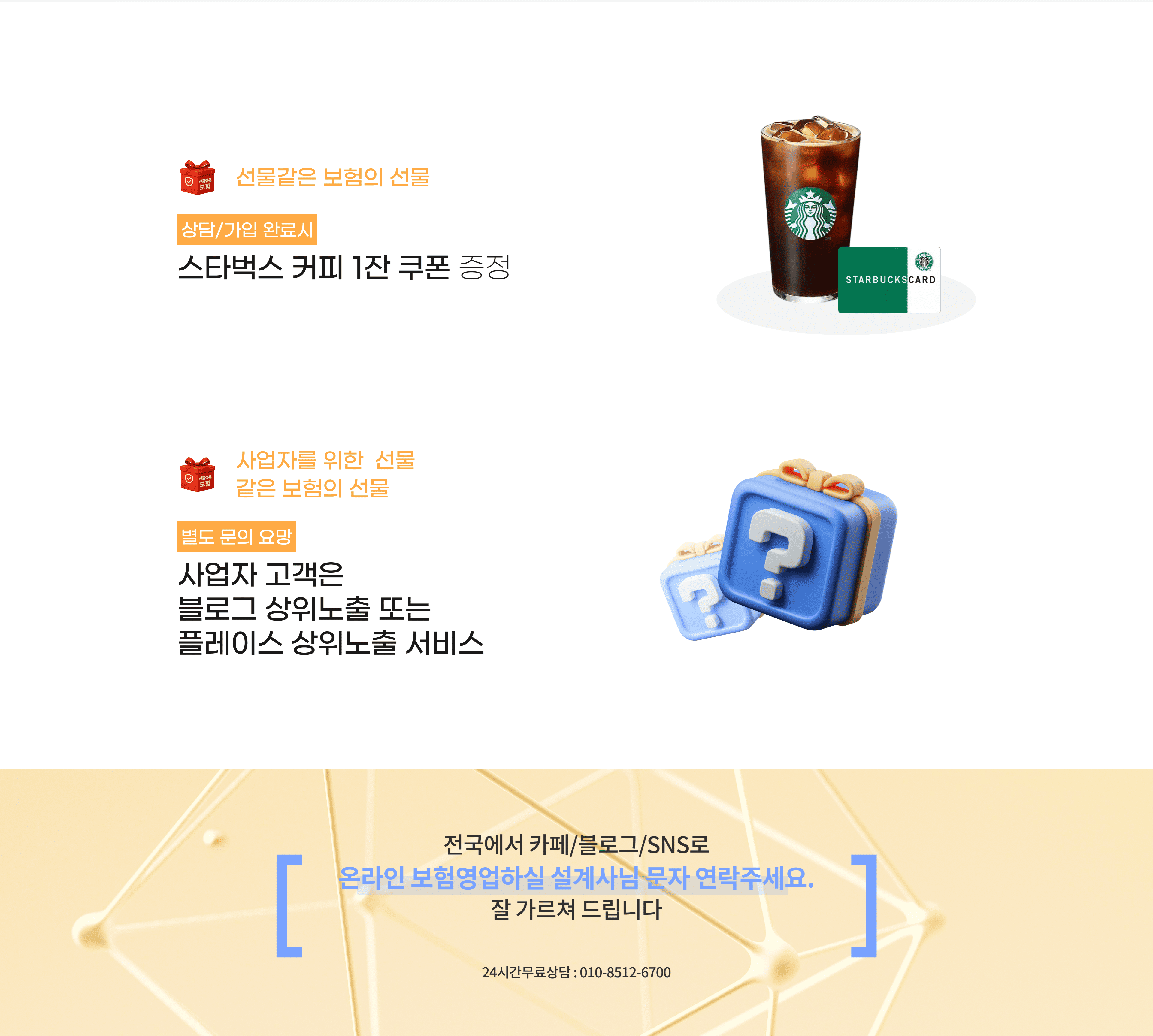 선물같은보험에 신청한 상담 정보는 에이원금융판매(주)에 제공할수 있으며 상담완료/ 가입시 제공하는 (스타벅스 커피 1잔 쿠폰)선물도 에이원금융판매(주)가 상담시 제공함을 원칙으로 한다.